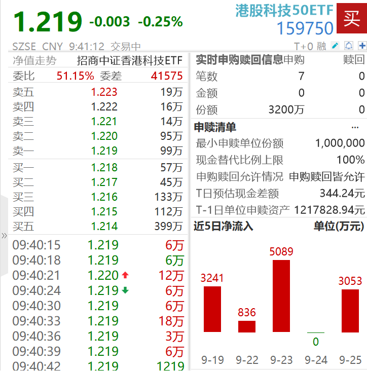 港股科技50ETF(159750)跌0.25%,成交超4600万元,盘初交投活跃。行情数据显示,该ETF获实时净申购3200万份,近10个交易日获资金净流入合计2.87亿元。